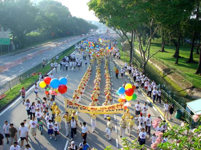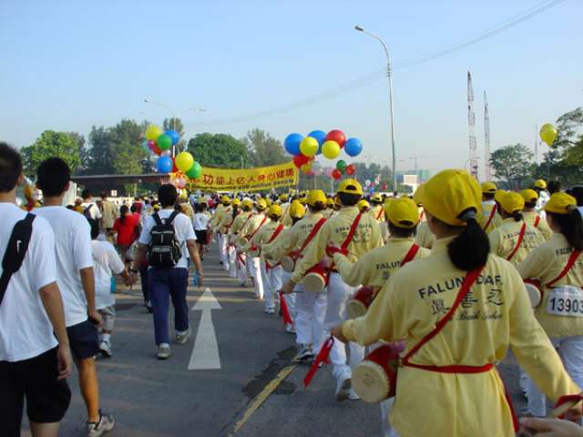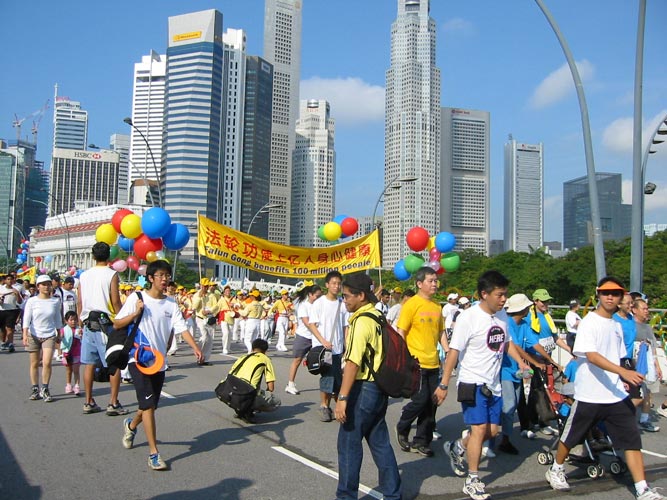 在这一天,新加坡法轮功学员意气风发的出现在浩浩荡荡的人流之中。他们身着黄衫,衣服上印着“法轮大法”或“真善忍”的中、英文字样,手擎大束彩色气球,高举着黄底红字的横幅,上写:“法轮大法好”、“法轮功使上亿人身心健康”、“法轮功传遍世界78个国家地区”。走在最前面的是法轮功学员的腰鼓队。几十名大法弟子英姿焕发,鼓声响亮整齐,步伐有力坚定。大法弟子的队伍色彩绚丽、神采奕奕,分外引人注目。好几位摄影记者一会儿站到高处、一会儿又蹲下忙着抢镜头,还有路人为他们鼓掌加油。