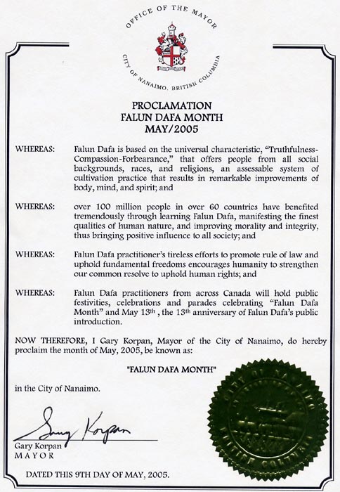 鉴此,我,加里•科潘(Gary Korpan),纳内莫(Nanaimo)市市长在此褒奖2005年5月为
