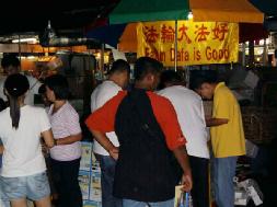 【明慧网2005年5月28日】马来西亚是热带国家,人们都喜欢太阳落山后出来散步,夜市也是热带国家的特色。图片是马来西亚学员在夜市展示