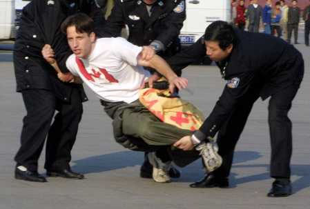 事后得知,那是发生在2001年11月20日下午2时许,36名来自英国、瑞士、德国、法国、美国、加拿大、澳大利亚等12个国家的西人法轮功学员在天安门广场打出“真善忍”横幅,为法轮功進行和平请愿并于广场就地打坐,数分钟后全部遭到中国警察非法拘捕。其中一人曾于天安门附近某拘押地点打出简短电话,向朋友告知自己的境况及CNN等海外媒体记者与他们同时遭到拘捕的消息。