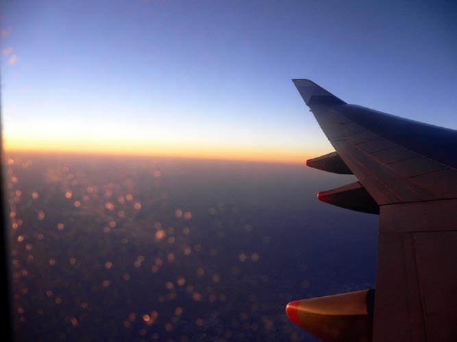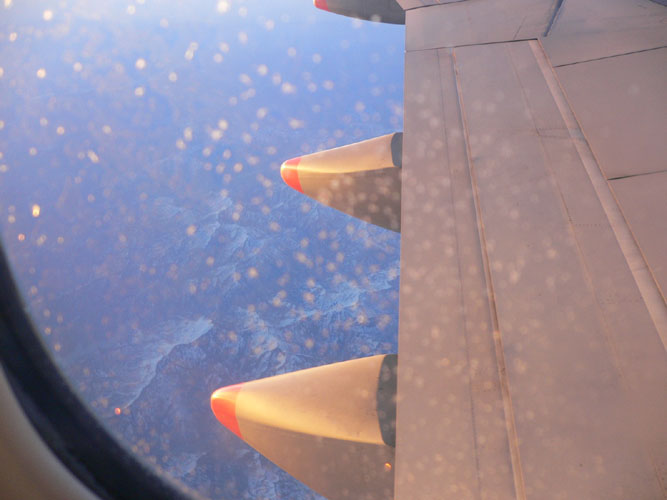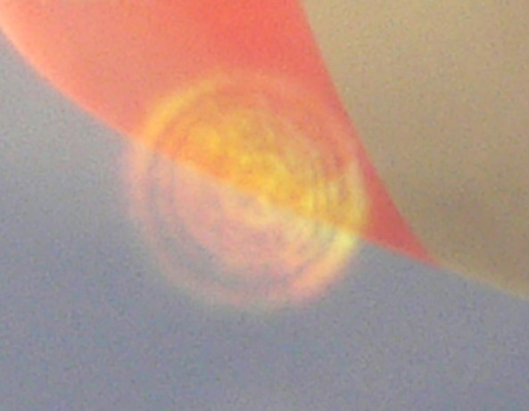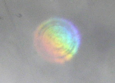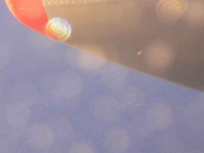 在我从纽约回来的飞机上,我们看到满天的法轮在我们飞机的四周伴随着我们回台湾,在拍摄时有个小插曲。当时要拍法轮照片的时候用肉眼看是看不见法轮的清楚轮廓与颜色,完全是要透过相机才看见法轮变换着色彩,我就跟几个法轮说,请他不要一直变颜色让我拍一张七彩的吧!法轮他就定下来让我拍到他七彩的形象,当然也有金色的透明的满天法轮,我跟他们说不要跑让我看清楚点!