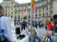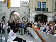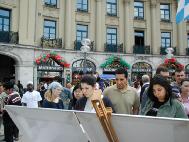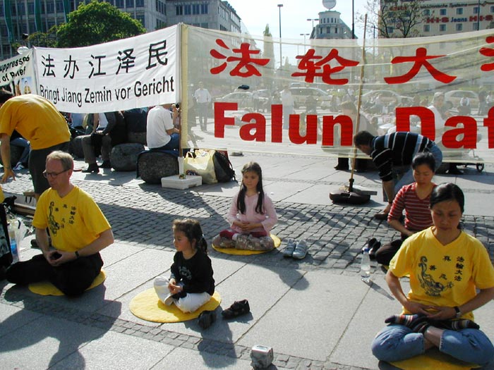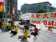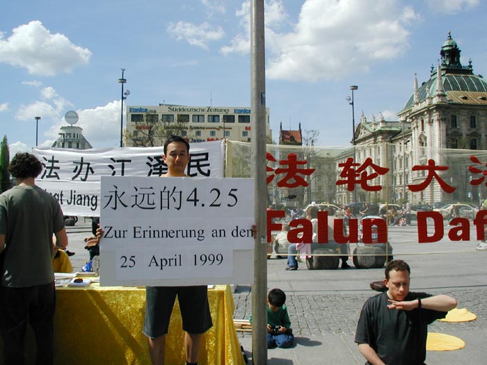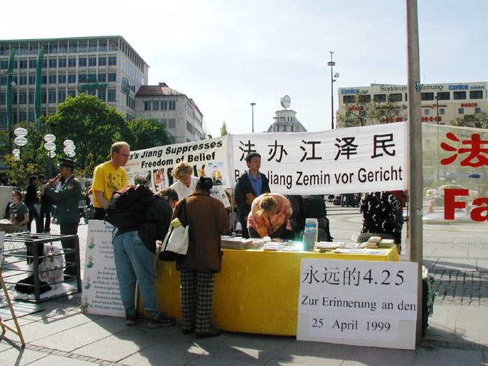 2005年4月30日,来自德国南部帕索(Passau)、奥古斯堡(Augsburg)、乌尔姆(Ulm)和慕尼黑(Munich)等地的法轮功学员聚集在慕尼黑的卡尔斯广场(Karlsplatz),举办纪念“4·25”六周年的活动。广场上人头攒动,早已将法轮功学员表演的反酷刑展围得里三层外三层的,被震惊的人们看着这一切,不断的向学员们询问着,索取资料。许多人在了解了法轮功的真象后,主动到展台前签名支持起诉迫害元凶江XX,呼吁营救法轮功学员姜仁政一家(姜仁政全家不久前因申请避难被拒,被德国政府遣送回中国,姜仁政随后被中共当局判三年劳教,详情请看明慧报道(姜仁政被非法关進劳教所 德国学员吁各界关注)。