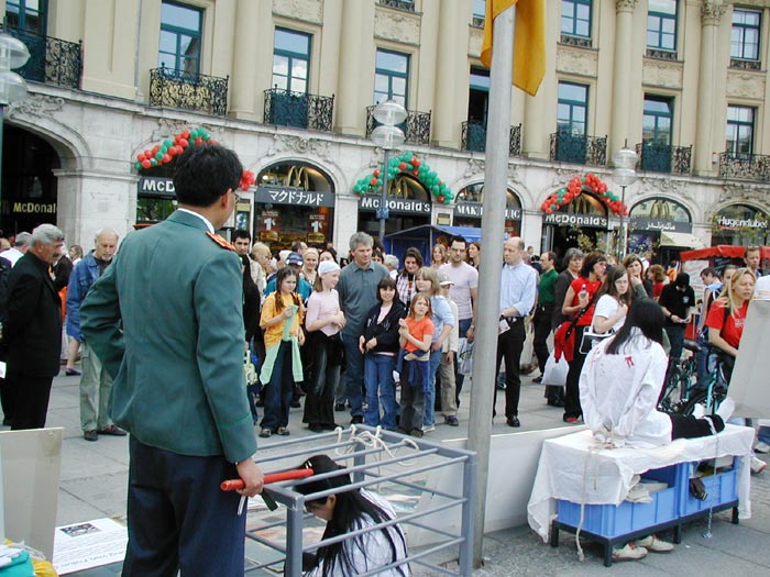 【明慧网2005年5月3日】年轻的工程师丹尼尔手举着“永远的4·25”的牌子,站在慕尼黑的闹市中心,在他身后悬挂着大幅“法轮大法”、“法办江泽民”等中德文横幅,他的身旁是几位静静炼功的法轮功学员,在摆满资料的展台另一边,身穿中国警察制服的青年男子正挥舞手中的“电棍”,一位满身“鲜血”的法轮功女学员被绑在老虎凳上,另一位女学员则被关在窄小的笼子里,一场真人模拟的酷刑表演展示着在中国劳教所每天上演的一幕。