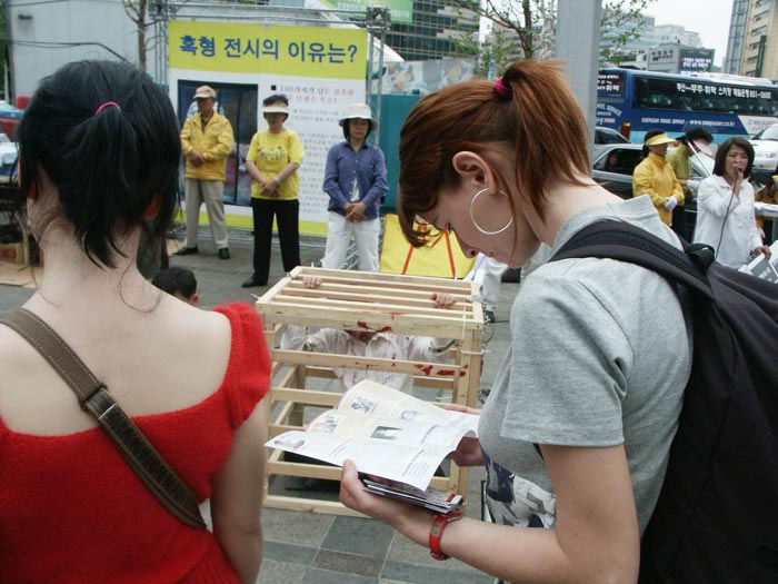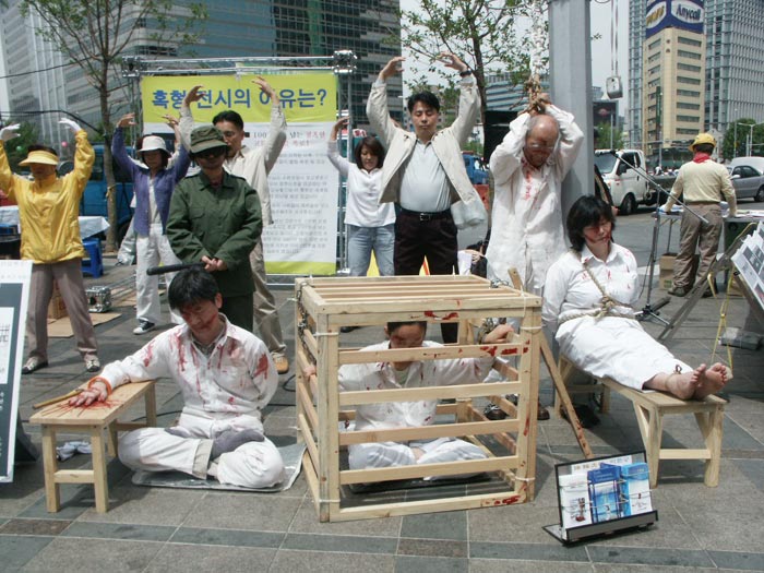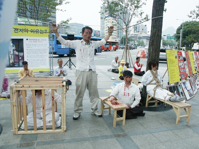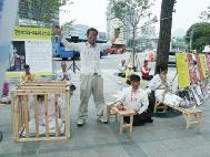 天气越来越热,参加模拟酷刑演示的学员们一动不动的坚持几个小时,很多观众纷纷问:“这是真人吗?”学员们讲:“这是真人,并且更残酷的迫害天天在中国发生,已经持续六年了。我们在这里把中共对法轮功的迫害揭露出来,呼吁善良的人们联合起来,帮助制止正在中国发生的这种人权迫害。”