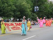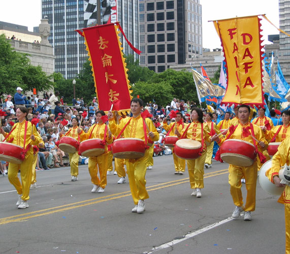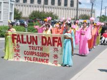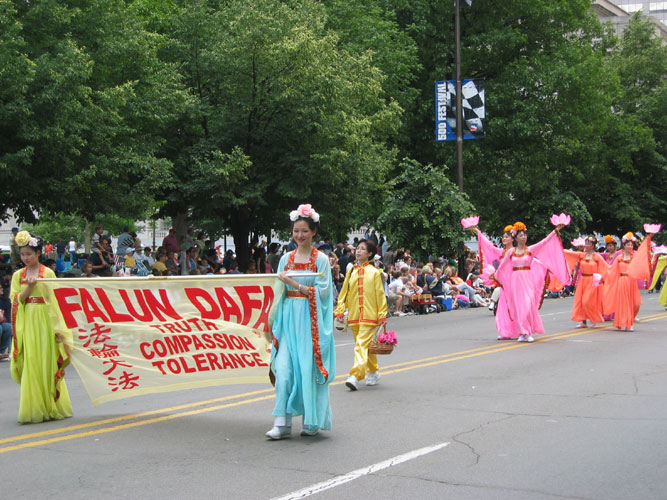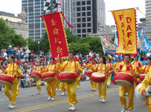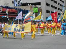 美中法轮大法协会为这次游行同样带来了“威风旗鼓阵”和“仙女莲花舞”。队伍最前面是印有“法轮大法”中英文的巨大横幅,游行队伍服装色彩鲜艳夺目,金黄色的炼功服,配着大红色的唐鼓,飞舞的鼓槌敲出战鼓般的鼓声,令人精神振奋。印有中英文“法轮大法”字样的旌旗在方阵中高高矗立。身着蔚蓝色炼功服的旗手,手持九色印有“真善忍”、“法轮大法好”的旌旗,不断变换着队形,穿插在鼓阵中,《鼓乐神威》的乐声中旗鼓表演有机的结合在一起,表现出勇士凯旋归来的庆典场景。在“威风旗鼓阵”后面是由8名女学员带来的“仙女莲花舞”,悦耳的音乐,优美的舞姿展现给人们更多的是祥和和喜悦。