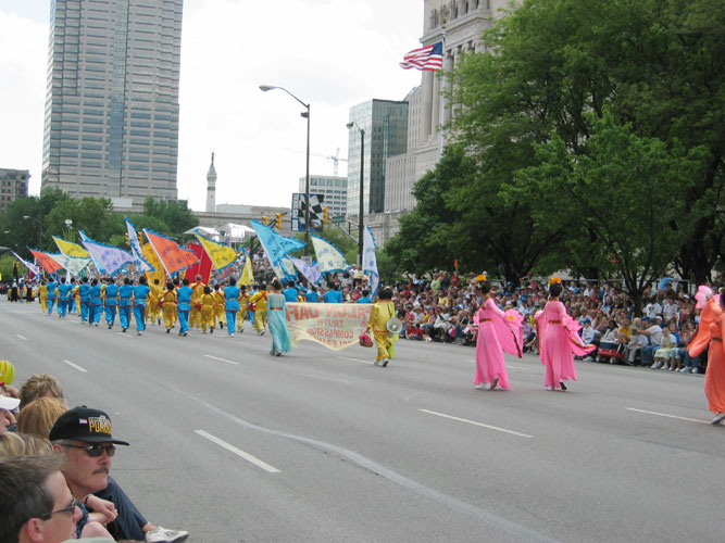【明慧网2005年5月30日】2005年5月28日,印第安纳州(Indiana)的首府印第安纳布利斯 (Indianapolis)的天气格外晴朗,到处洋溢着节日的气氛。第48届美国著名的 “印第500大游行” (Indianapolis 500 Festival Parade)在该市中心隆重举行。在场观众有30万,CBS,ESPN2 国家广播电台(National Broadcast on ESPN2),WISH-TV 8频道和多家当地电视台都到现场進行直播和转播。主办单位从全美精选出80家团体参加了本次表演游行。在2004年芝加哥感恩节游行中大放异彩的美中法轮大法协会的“威风旗鼓阵”也被邀请参加并作为具有东方色彩团体的唯一代表。