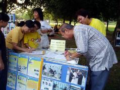 这些善良的市民,在了解真象之后,都纷纷签名支持法轮功。尤其一群为数十多人的女学院生,每个都义不容辞的签上自己的名字。由于签名的人很多,以致学员们所准备的征签纸都签满了而必须在纸背后划线,继续让大家签名,但是最终还是不足以应付众多想签名支持正义的人士。