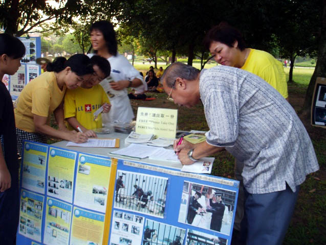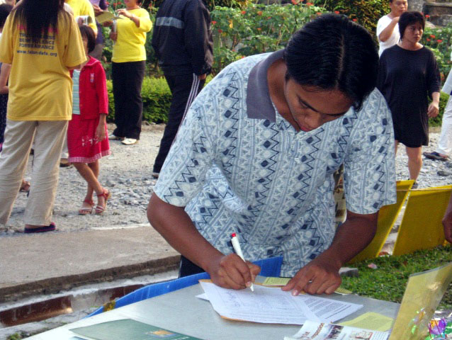 许多非华裔的友族如马来人在了解真象后就直接签名支持法轮功,而且觉得这是应该做的事情。有个马来人在签名后,继续逗留在那儿观看学员们祥和的炼功、跟民众讲真象的真挚神情,以及多人签名支持的情景,他脸上帶着敬意和赞许。