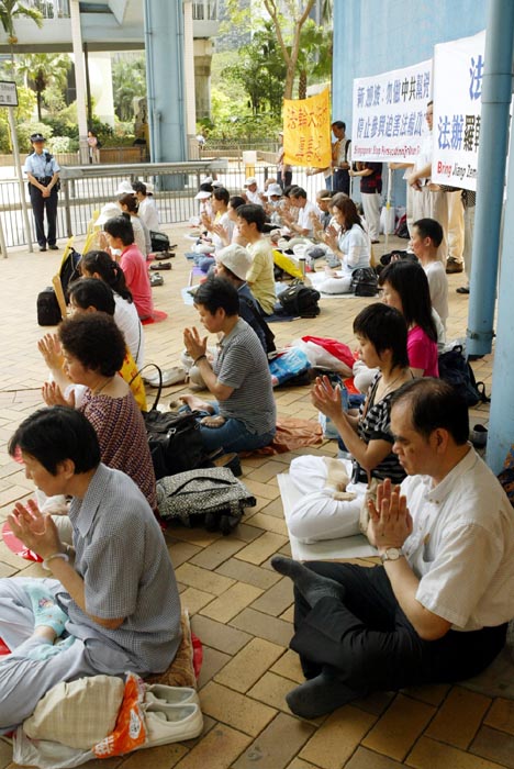 2002年3月14日,16名瑞士和香港的法轮功学员在中联办前和平请愿呼吁制止迫害,但警方出动数十人将他们逐一抬上警车,其后并控以“阻街”和袭警等7项罪名。同年8月,原审法庭裁定7项罪名全部成立,并判处各人1300至3800港元不等的罚款。事件引起社会广泛关注,被视为一宗政治审判。