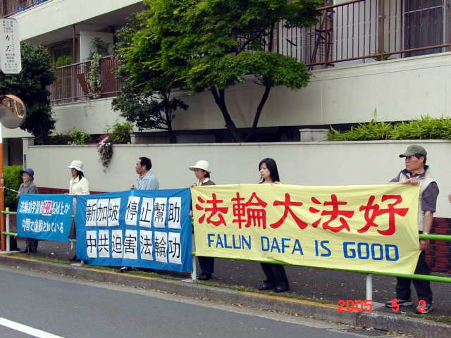 【明慧网2005年5月5日】日本法轮功学员继2005年5月1日来已连续四天在新加坡使馆前抗议新加坡法庭对法轮功学员的不公正判决,希望新加坡政府了解真象,认清时势,不被中共的淫威所惑,不当中共