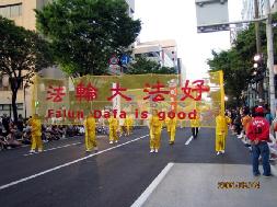 下午6时左右,法轮功学员的游行队伍一出现,立刻吸引了人们的注意,队伍的最前面是“法轮大法好”和“真、善、忍”的巨型横幅;紧跟着是具有中国传统文化色彩的舞龙和舞狮,学员们精彩的表演博得了观众们阵阵的喝彩声和掌声。随后是身着古装的仙女队和唐装队,她们翩翩起舞,宛若下凡的仙女,许多观众用相机拍下这精彩的瞬间作为纪念;队伍的最后是英姿飒爽的腰鼓队。