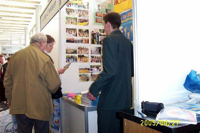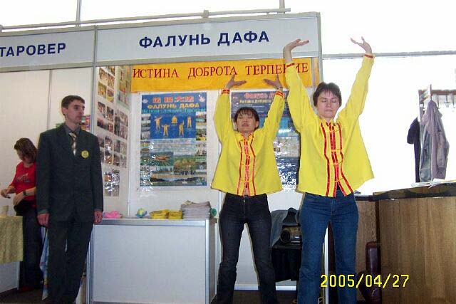 ![]() 展位前的观众 | ![]() 展台前炼功 | ![]() 为莫斯科法轮大法学会颁发的奖状 |