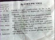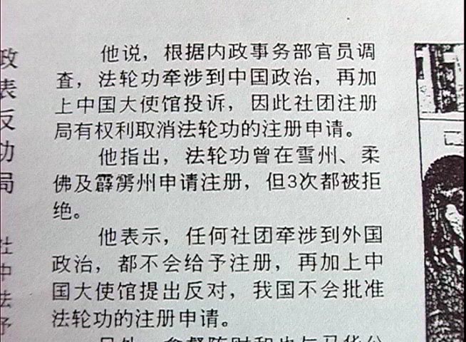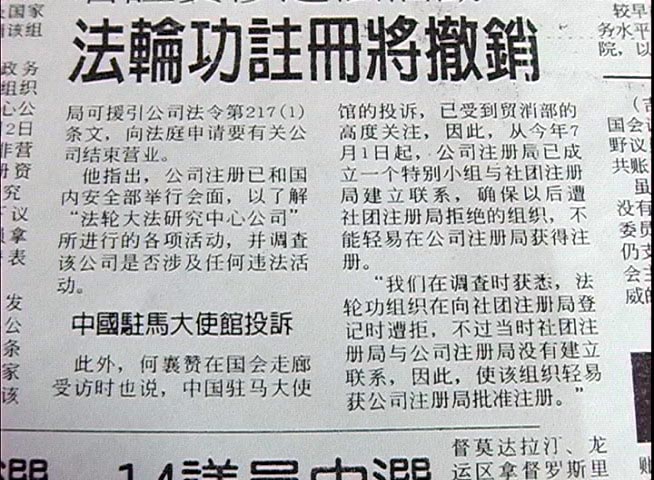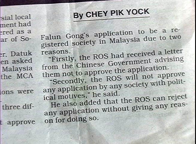 马国报章上的多篇报道都曾经报道了中使馆干涉社团注册局和公司注册局,致使当局拒绝了法轮功的注册申请的事实。