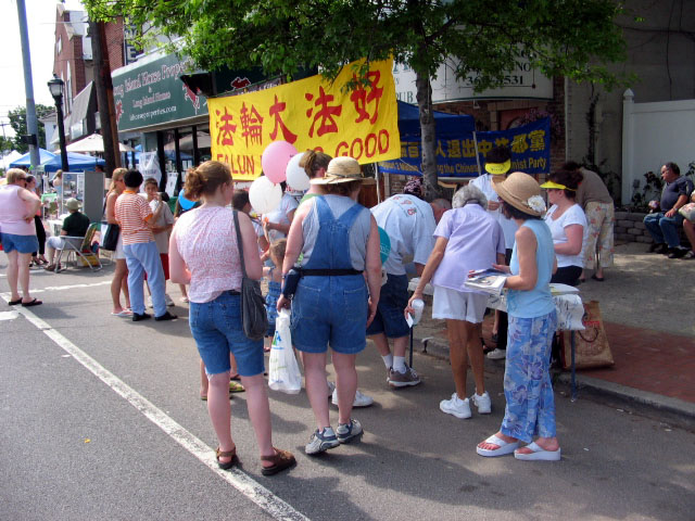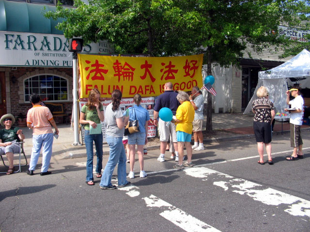 【明慧网2005年6月15日】美国纽约长岛史密斯镇于2005年6月12日迎来了一年一度的街市节(“Smithtown Annual Festival Day”),来自长岛400多个公司和个体商家,一大早就摆好了摊位,显示出热热闹闹的气氛,长岛法轮功学员也来到这里。学员先将真象资料送给了各个商家;百分之九十八的商家非常高兴的接过了资料,并认真的看起来。