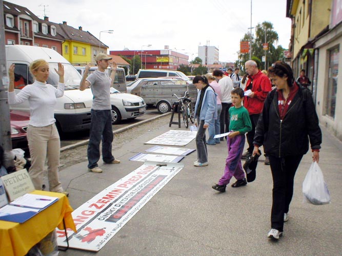【明慧网2005年6月16日】2005年6月11日,斯洛伐克的法轮功学员们来到西部的小城市—玛拉其(Malacky),在市中心的Mierove广场举办洪法活动,展示功法,征集签名,发放真象传单,告诉那里的居民们发生在中国大陆已经持续了近6年的残酷迫害