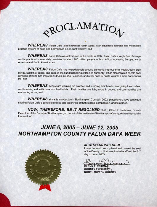鉴于,法轮大法自2002年传入北安普敦县后,修炼者坚持不懈的与人们分享法轮大法柔和的功法和真善忍的法理。