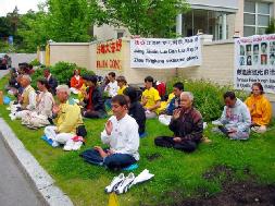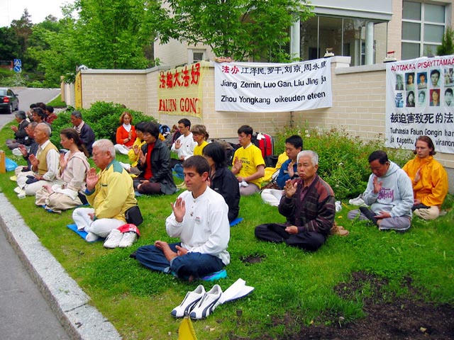 【明慧网2005年6月21日】2005年6月14日,来自欧洲及台湾的法轮功学员在赫尔辛基中共大使馆前举行和平请愿活动,要求中共立刻终止六年来对法轮功学员施加的有系统的人权迫害