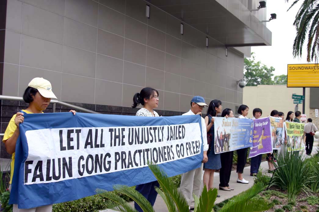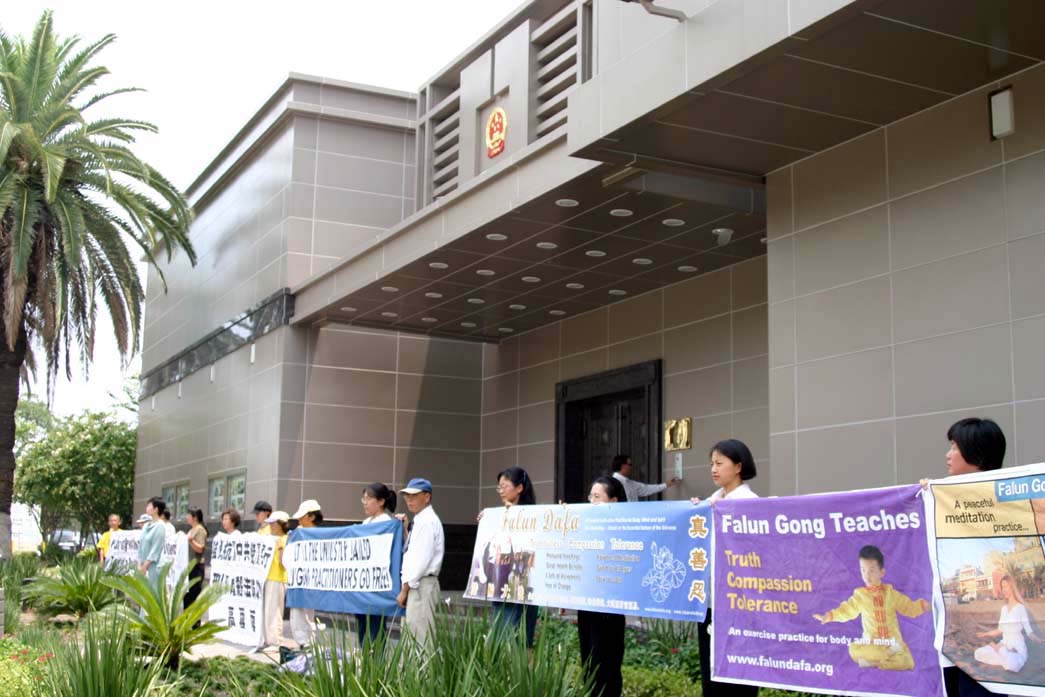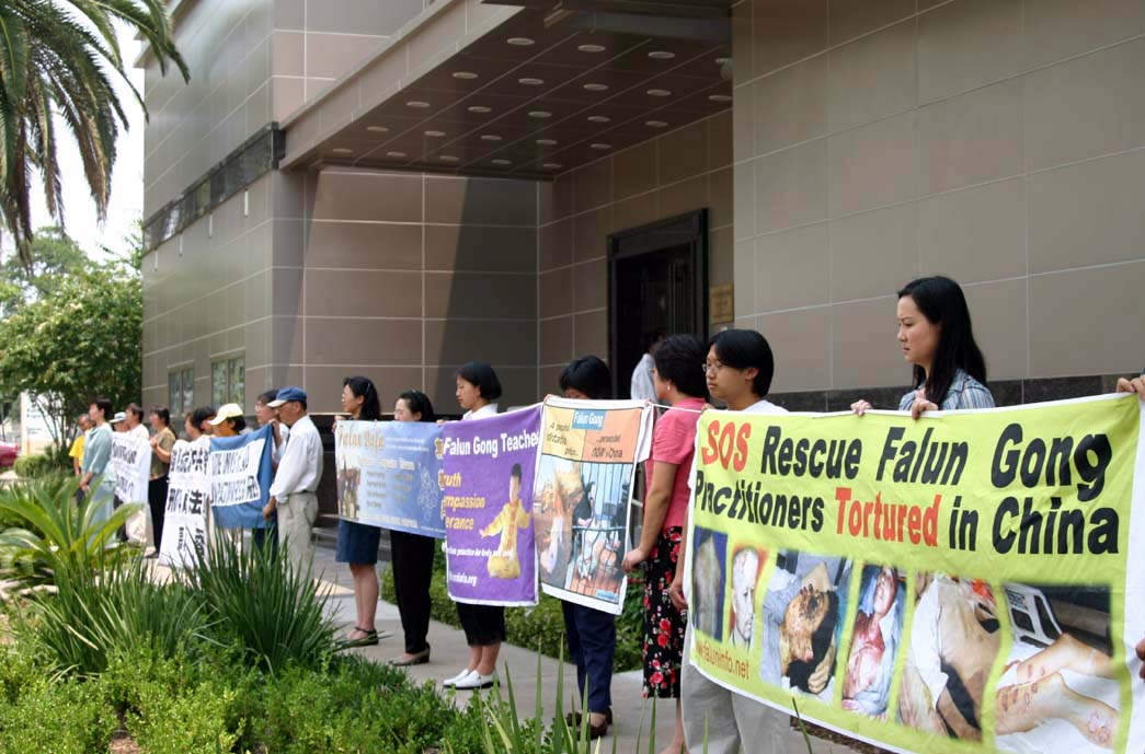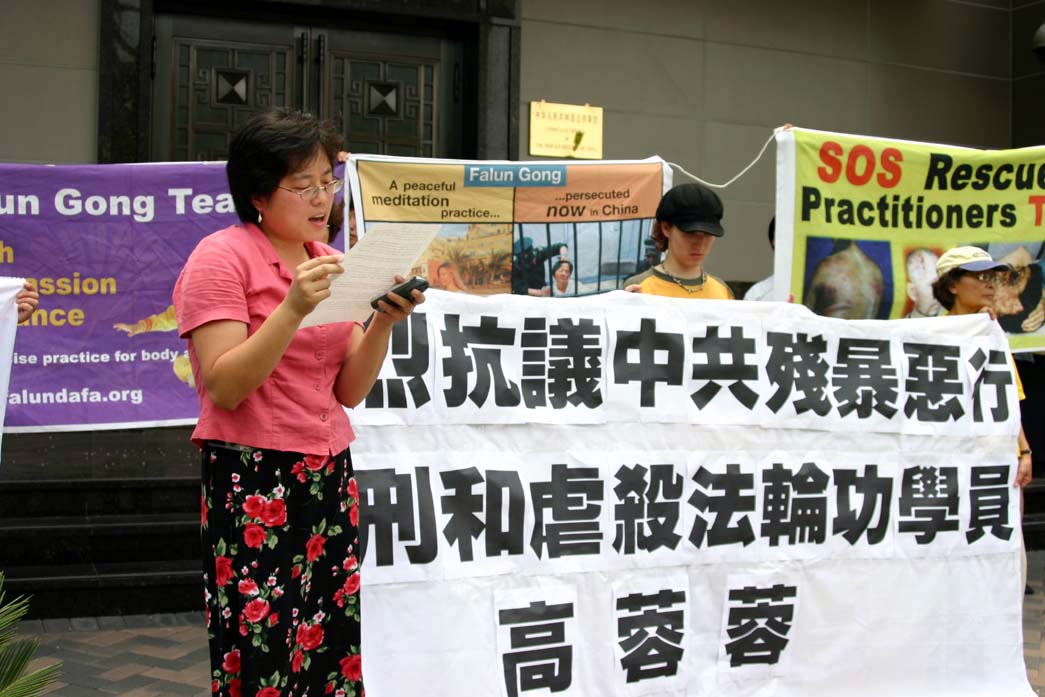 法轮功学员强烈谴责中共暴行,并强烈要求缉拿将高蓉蓉毁容的唐玉宝和姜兆华、及将她迫害致死的杀人凶手,停止迫害。法轮功学员希望中共使领馆的官员们不要助共为虐,作中共的陪葬品,用自己的良知和人性来选择自己的未来。