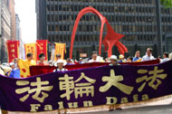 在随后的游行当中,学员们组成了不同的方阵,有功法展示、大法洪传世界、揭露迫害、酷刑、全球诉江等,从联邦广场一直游行到芝加哥中领馆前,并在那里集体发正念。
