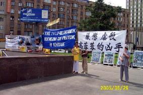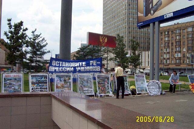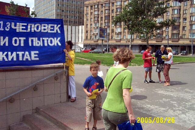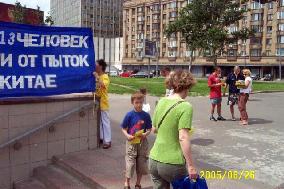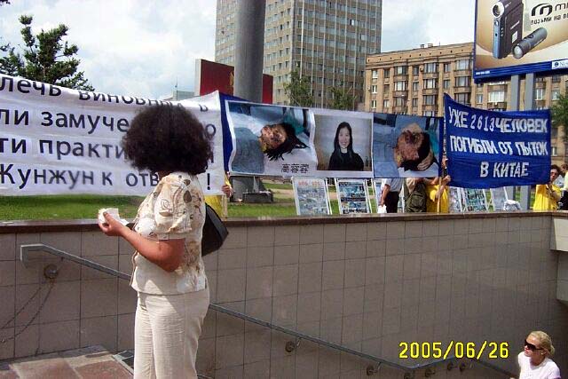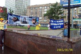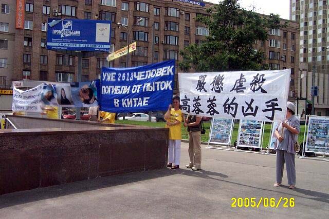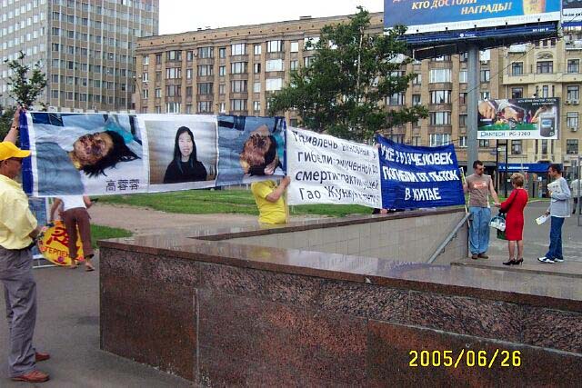 【明慧网2005年6月27日】2005年6月26日下午,俄罗斯大法学员在莫斯科斯摩棱斯克广场(俄罗斯外交部前)举行和平集会,谴责中共虐杀法轮功学员高蓉蓉。高蓉蓉被