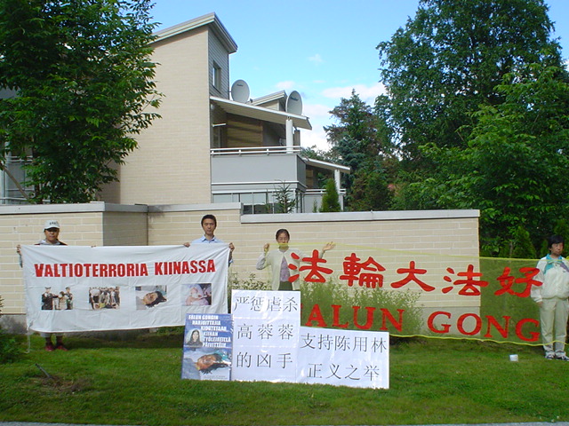 其间当几位老人散步经过时,一老人主动询问学员们是否在抗议,学员回答是的,并向他讲述了因高蓉蓉修炼法轮功,中共及江××邪恶集团对她施以酷刑毁容而后迫害致死的事实真象。老人说,希望他们(指中使馆)能听到你们的声音。