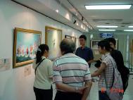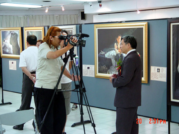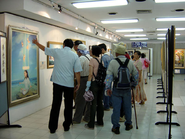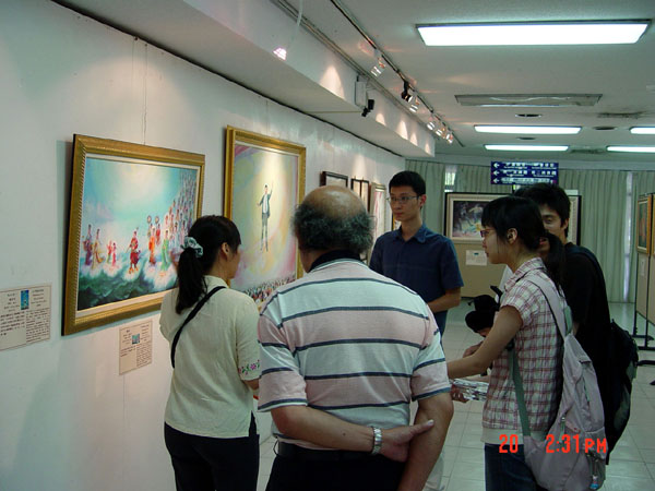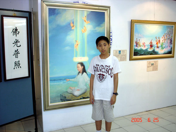 有一位大二的学生,被正对美展大门的一幅面带微笑的佛像吸引住,驻足在佛像前很久,他说这尊佛的眼睛会动,他的面容好慈悲,他的手在接引我,因为这尊佛像所以才进来看画。很多看完画展的学生都留下电子信箱,希望能获得更多讯息。25、26日画展最后两天同时安排一场生命教育研习营,除了播放师父讲法录像带和教五套功法外,还邀请专家学者演讲。