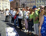 在触目惊心的反酷刑展前,一直围有人墙,许多人伸长了脖子探着头看;还有人用拳头压住自己张大的嘴,全身紧张的缩着;许多人不忍心看下去,却又不舍得离去;还有许多人用相机,手机拍照;签字支持的人络绎不绝,其中有来自世界各国的游客。