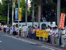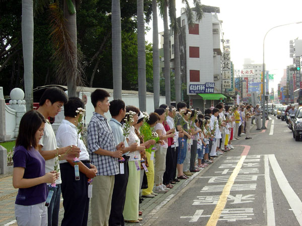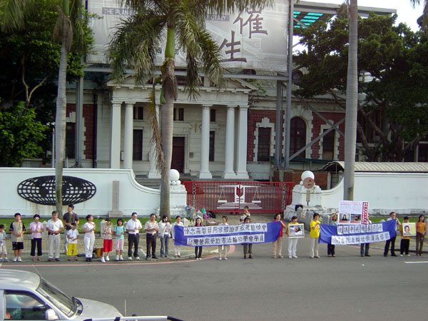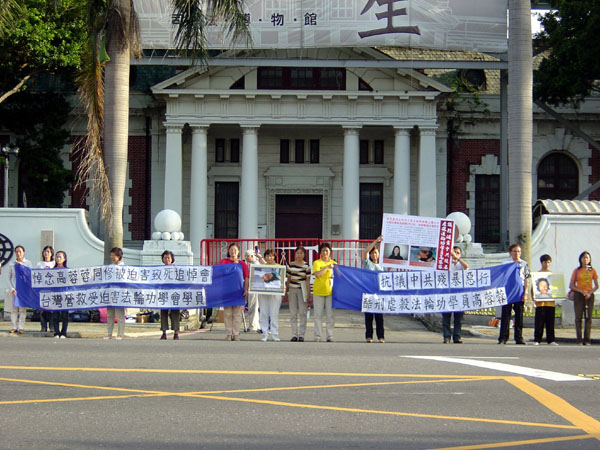 交流会结束后,下午 4:50学员赶赴以前台南地方法院(现改为司法博物馆)参加高蓉蓉的追悼活动,并抗议中共暴行。高蓉蓉是中国境内被证实迫害致死的第2585位法轮功学员。2004年5月间,高蓉蓉在劳教所被严重电击毁容的相片曝光海外,一时间中共对法轮功的迫害凶残受舆论挞伐,中共反加紧迫害,经证实高蓉蓉于上周被迫害致死。有三位台南法轮功学员表示: