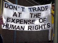 ![]() 横幅上写着:唐纳先生,不要帮助中共迫害法轮功 | ![]() 不要以牺牲人权来进行贸易 | ![]() 不要限制法轮功学员的言论自由 |