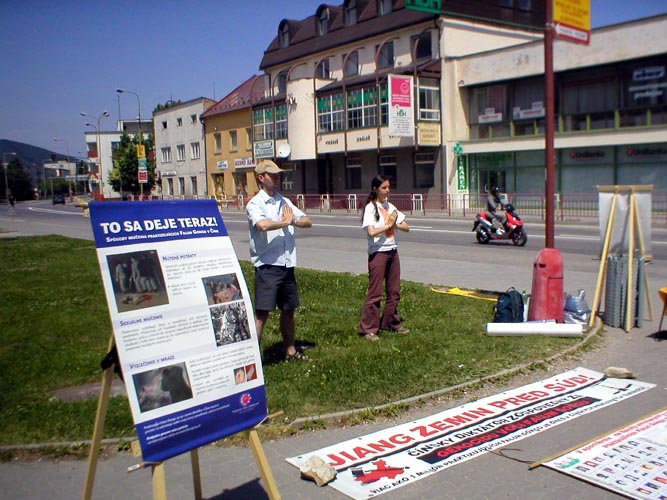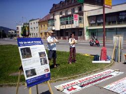 【明慧网2005年6月7日】2005年6月4日星期六,几位斯洛伐克法轮功学员来到了约有40,000居民的斯洛伐克西部城市Povazska Bystrica。学员们在这里炼功,并摆出大型的揭露中共江氏集团残酷迫害法轮功学员的真象展板。很多过路的人们停下来在征签表上签名支持反迫害。
