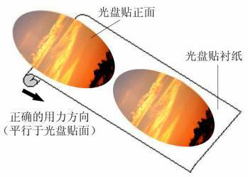 我们在大量的实践中发现,在贴光盘封面的时候,只要保持光盘封面的完整,就可以很方便快速的贴好,并且质量很好。我们也发现,直接揭光盘封面(圆贴)本身,很容易造成光盘贴中心的几个圆圈分离,造成要想贴好它很困难,我们采用了不直接揭光盘贴,而是去揭它下面的衬纸,衬纸和光盘贴的接触面很光滑,很容易揭下来,并且能保持光盘贴的完整,这样就容易贴了。即技巧的关键——揭光盘贴衬纸,而不是直接揭光盘贴。