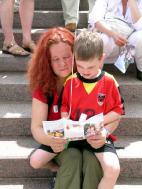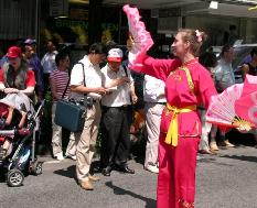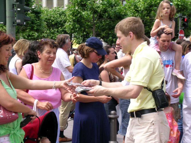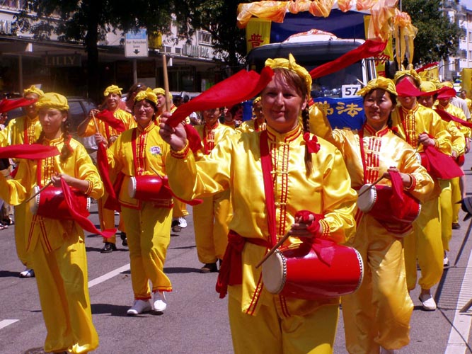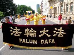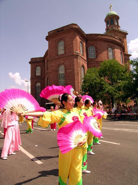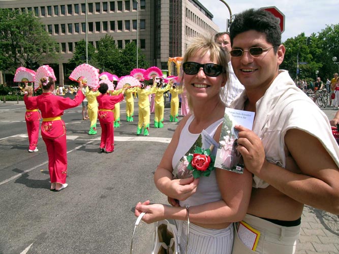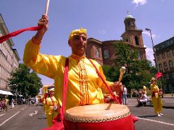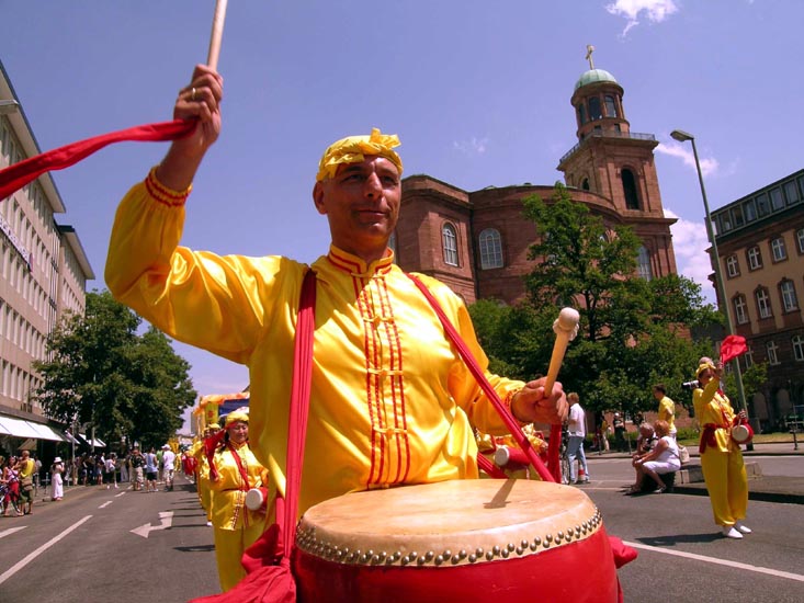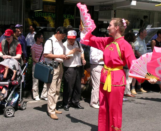 【明慧网2005年7月1日】每年六月,法兰克福(Frankfurt)市政府都会举办一年一度的夏季多元文化游行。二零零五年六月二十五日,法兰克福几万观众顶着烈日兴致勃勃观看风格各异的游行队伍,德国近百名法轮功学员身着中国民族服装参加了游行,为观众们表演了扇子舞,莲花舞,腰鼓等中国传统节目。沿街观众中不断传来掌声。途中遇到的几个从中国来的旅游团也纷纷给学员们照相,并接受了法轮功的真象资料。