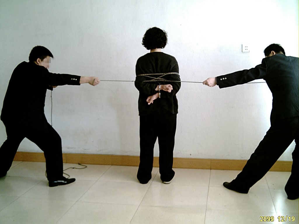 杜桂华被强行带到第一看守所三楼会议室,恶警开始对她刑讯逼供。他们把她的手背过去用手铐扣上用细绳勒,勒一会儿,松一会儿,一下午给其上了4、5次刑,打嘴巴子,脸都打肿了,晚上又把她铐在暖气管上。