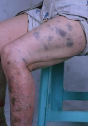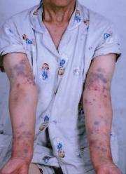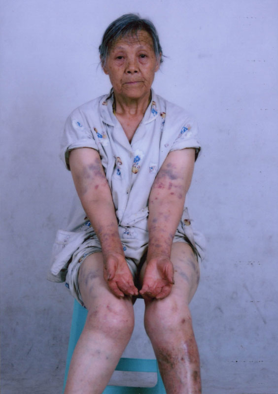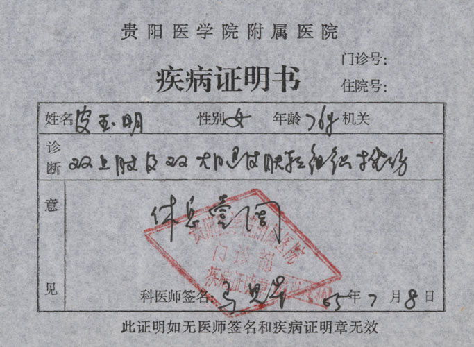 以下是贵阳医学院检查皮玉明后开的诊断证明及皮玉明被恶警拧扭致伤的照片。