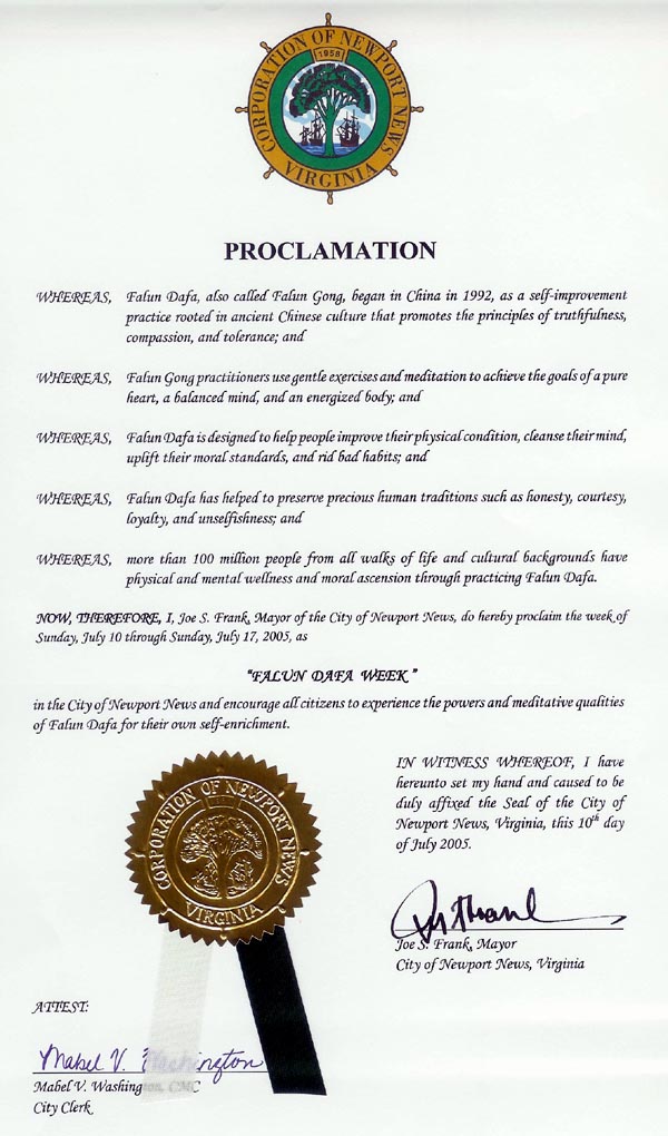 鉴此,我,乔•弗兰克(Joe S. Frank),纽波特纽斯(Newport News)市市长,在此宣布2005年7月10日(星期天)至7月17日(星期天)为纽波特纽斯市