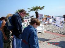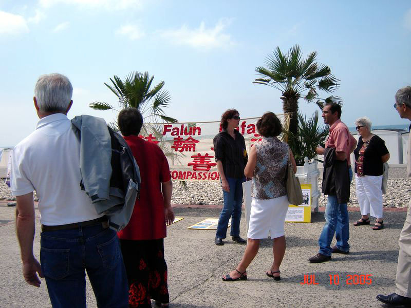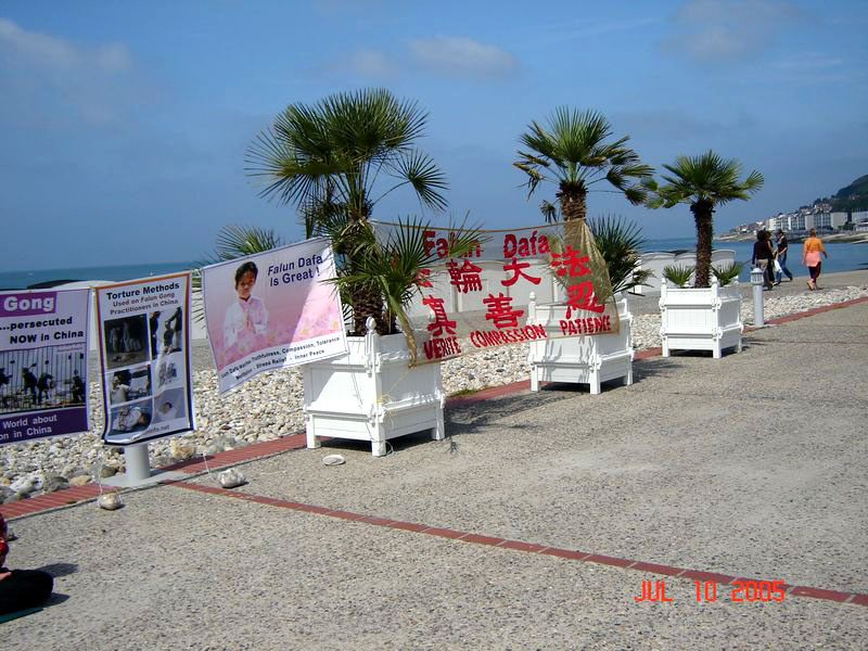【明慧网2005年7月17日】2005年7月10日,我们来到此次诺曼底讲真象之行的最后一站——勒阿乌尔(LE HAVRE),展位位于塞纳河岸的勒阿乌尔海滨浴场边的广场上。勒阿乌尔是一个聚集富人及休闲度假的地方,周末的海滨阳光灿烂,人们或是在大海中畅游,或是闲情漫步,或是举家自行车漫游。