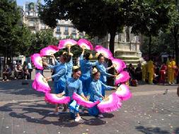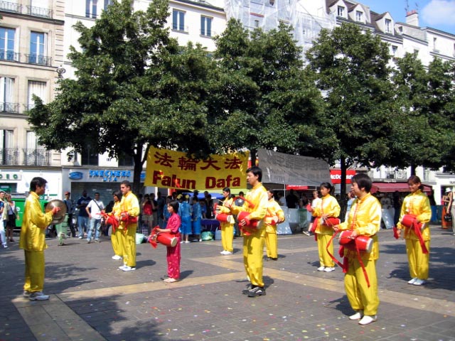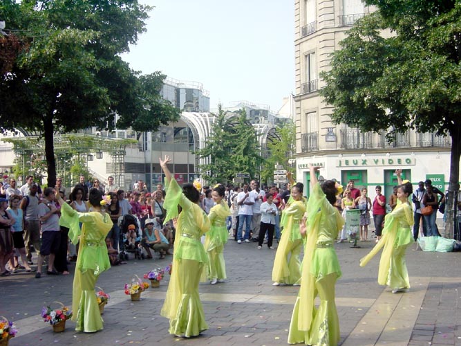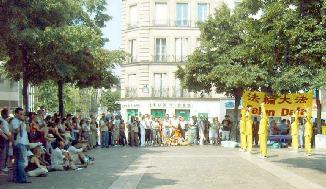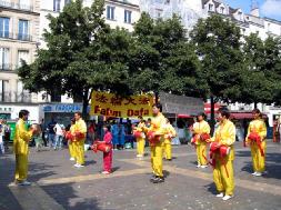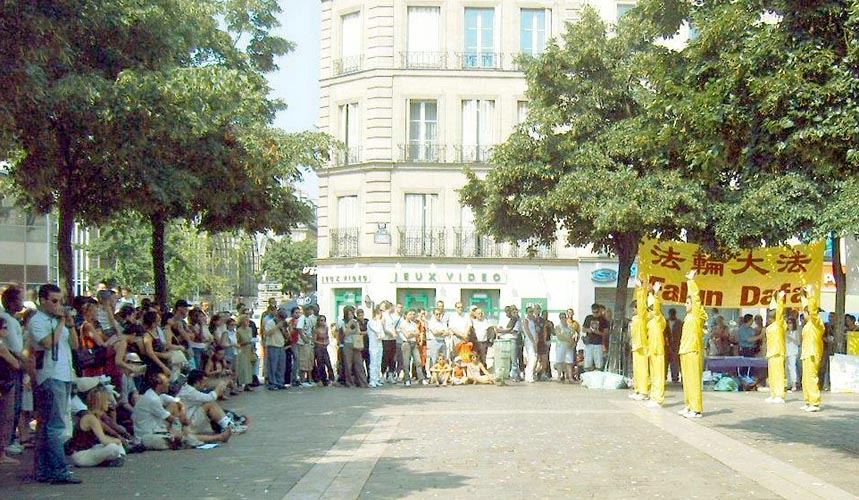法轮大法的横幅高高的悬挂在法国梧桐树之间,介绍大法在世界各地洪传及法轮大法弟子遭受中共邪党残酷迫害的展板陈列在广场的一边,信息台上放满了十几种语言的法轮功简介资料。一部份法轮功学员向观众表演上了优美舒缓的功法、飘飘欲仙的天女散花舞、威武的腰鼓及具有浓郁中国传统风格的扇子舞。同时,另一部份法轮功学员派发传单并解答观众的疑问。