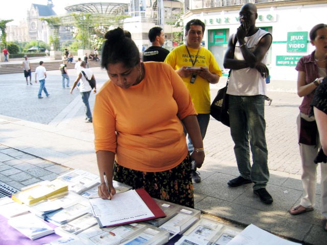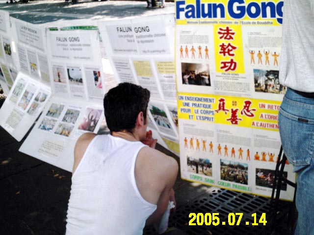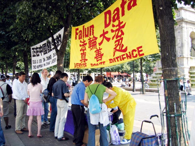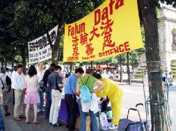 一位法国女孩看了真象展板后既愤慨又无奈,问学员如何才能结束这场迫害,学员告诉她去传播真象,让中共邪灵对无辜的法轮功学员所犯下的滔天大罪暴露在光天化日之下,要坚信正义必胜。女孩点了点头。