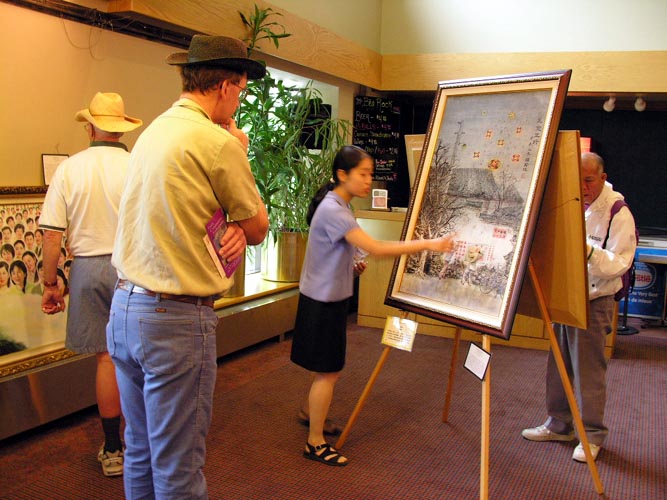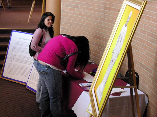 一些大陆来的观众也有缘参观了画展,有的说:我虽然不炼法轮功,但我相信法轮功是好。有的说,我们不相信国内媒体的宣传,比如“天安门自焚”,一看就是假的。并就他们不太理解的、或受造谣媒体误导的问题询问了法轮功学员。得到了圆满的解答后,连声说“谢谢你们。”