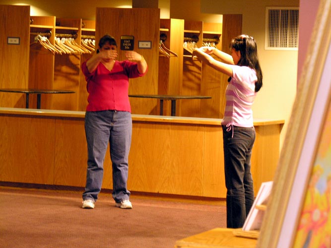 ![]() 一位参展的观众在展厅的一角学起了法轮功 |