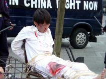 法轮功学员遗孤刘晓天,如今已是走在正法修炼路上的大法弟子,今天他再次扮演受迫害的法轮功学员,他说:我的爸爸妈妈,是在这场迫害中失去生命的,我也因此成了孤儿。今天我在这里向人们展示国内的法轮大法弟子们所遭受的痛苦,是希望能够使这场迫害早日结束,使大法弟子的孩子们,有自己的幸福家庭,使我所遭受的悲剧不再重演。