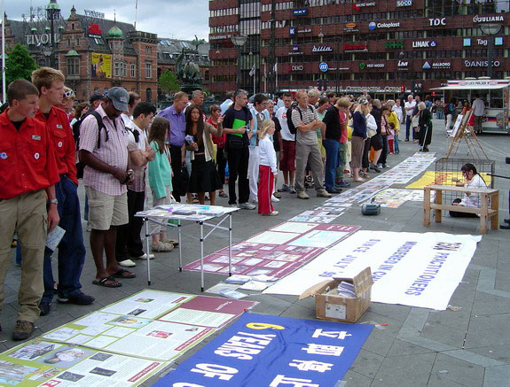 7月16日下午,部份丹麦、瑞典法轮功学员在哥本哈根市最大的广场——市政厅广场,向世人展示发生在中国的这场惨绝人寰的群体灭绝迫害罪,和法轮大法弟子在“真善忍”修炼实践中所体现的和平、坚定风貌。