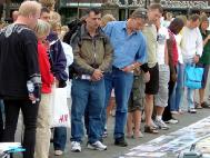 一位来自大陆的中国同胞,和一位西人学员进行了长时间的交谈。他在思考学员告诉他的真象,虽然在中共的恐怖威胁下,他和大部份中国同胞一样,心里有着深深的恐惧。当他和学员交谈时,仍然是惊魂未定的环顾左右,怕被媒体的摄像机照进镜头。当他收下真象光盘时,他诚恳的说:明天我就要回中国了,今天晚上我会在旅馆把它们看完的,但我不敢带回去。我们深深的祝愿这位可贵的中国同胞,大法的真象将会使你拒绝恐惧,变得坚强,正义将会在你善良的心中成长,并带给你身边的中国同胞们。