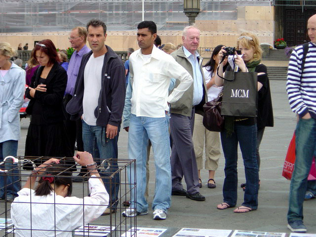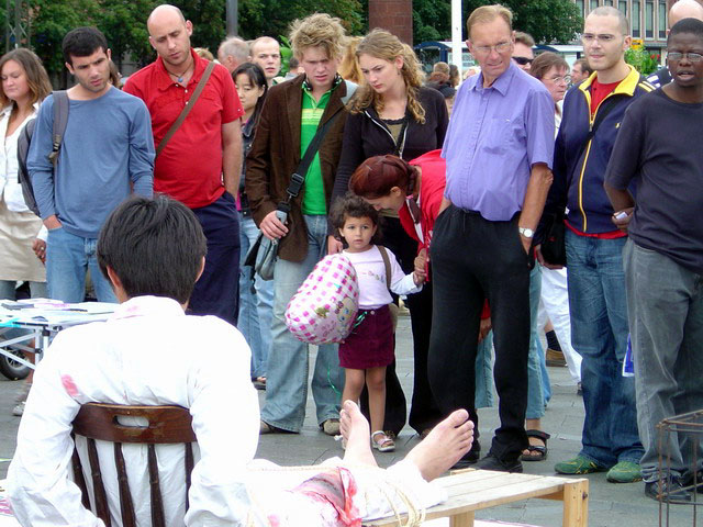 这些残酷的场面,详尽的叙述震惊了每一位过往的行人,在展示的整个过程中,围观的人群没有一刻减少过,仿佛一堵人墙。许多人长时间停留,仔细阅读图片上和法轮功学员们为“7.20”六周年所制作的传单,和多个学员交谈;许多人认真的倾听反复播放的酷刑展的解说词;许多人表达了他们对发生在中国的迫害的愤怒,对西方政界及媒体由于经济利益而保持沉默的批评与谴责;许多人拿出了照相机,摄像机,拍下这令人震惊的场面。