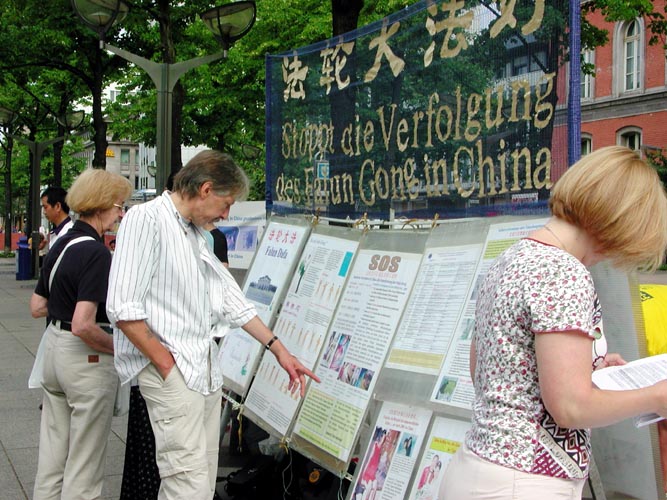 笔者在征签时遇到一个有趣的事例。在展台附近的一条长凳上坐着一个年纪约六十来岁的德国人,好象无聊又无奈的打发着时光,给他传单不接,给报纸也不要,于是我就给他讲:那边正演示的静功叫法轮功,法轮功在中国受迫害已经六年了。中国共产党和希特勒一样也是独裁者,中国至今仍然没有民主和信仰自由。