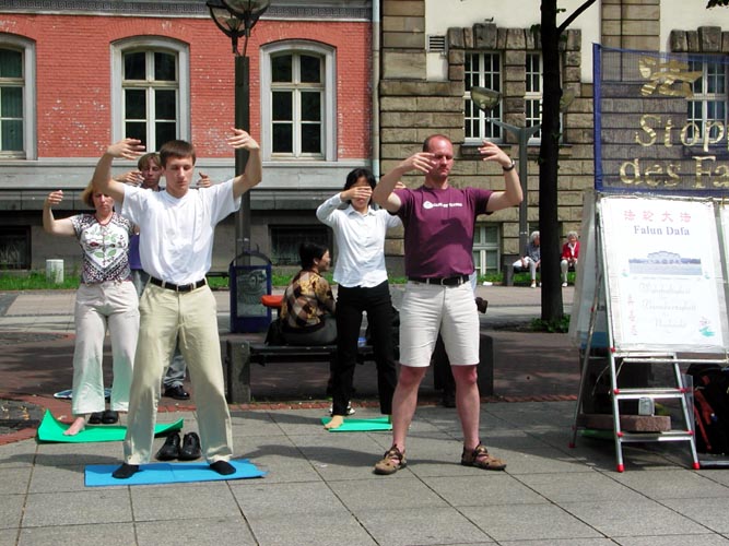 一位德国人约在两年前就买《法轮功》一书自学炼功,与此同时他还练着别的一些功,如太极等。据他讲,他在这方面已经探索了20多年,练过多种不同的功法。大约一年前,他已把其它的都放弃掉了,只炼法轮功,又买了《转法轮》一书,但一直是独自炼,也看书,就是不参加集体炼功学法,可我们每次在杜市的活动他总能不期而至。这次的活动他又是不期而至,还和一位德国学员谈了很长时间,又在一边观看学员炼功,看了很久,直到他必须去上班才走。