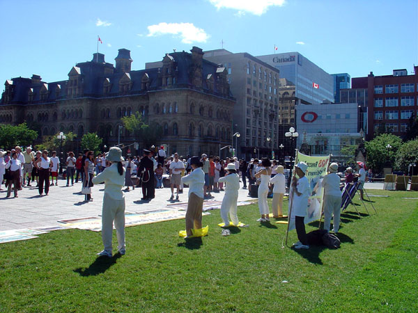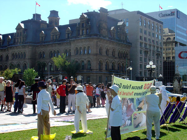 在人潮涌动的国会山前,草坪上一些身着白色的法轮功学员静静的打坐炼功,另一些则向过往的游客介绍法轮功,讲解真象。