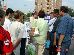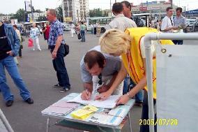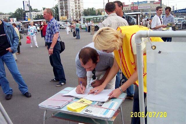 从1999年7月20日中共江氏集团开始镇压法轮功至今已经6年了。六年来中共恶党用欺骗和暴力不仅残酷的迫害修炼“真、善、忍”的法轮功学员,同时毒害着世人。法轮大法学员在遭到中共灭绝性的残酷迫害的艰苦环境下,一直坚持着和平理性的向世人讲真象。用自己的真诚和善良化解着邪恶的谎言,唤醒着人们的良知。俄罗斯是受中共党恶党谎言欺骗毒害比较深的地方,加之经济利益上的诱惑,环境更加复杂。俄罗斯法轮功学员克服来自各方面的干扰,利用一切机会向世人讲清真象。