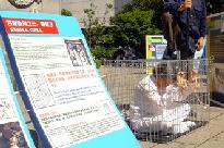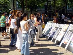 营救孤儿的图片展前,过路的民众停下脚步,仔细观看并听取学员们的介绍,他们被震惊了,不断的问:“为什么?”很多人询问如何帮助营救他们。明白了真象的民众纷纷在营救孤儿的明信片上签名。一群学生听取了真象后,围在一起认真讨论,然后每人都签了营救儿童的明信片。