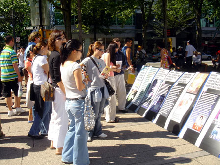 1999年7月20日,江泽民发动了对法轮功的全面镇压,至今已经六年过去了,迫害还在继续。每逢“7·20”来临,温哥华的法轮功学员都会進行各种讲真象的活动,他们是用自己的心在做,讲清真象、揭露邪恶,让更多受中共诬陷蒙蔽的人们了解中共对法轮功的残酷迫害,认清中共的面目,共同制止这场迫害。
